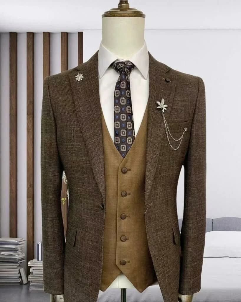 Make a lasting impression with this **luxurious brown 3-piece suit**, crafted for men who appreciate style, sophistication, and impeccable tailoring. This ensemble includes a **textured brown blazer**, a **contrasting tan waistcoat**, and a pair of well-fitted trousers, offering a perfect balance of classic and contemporary fashion.